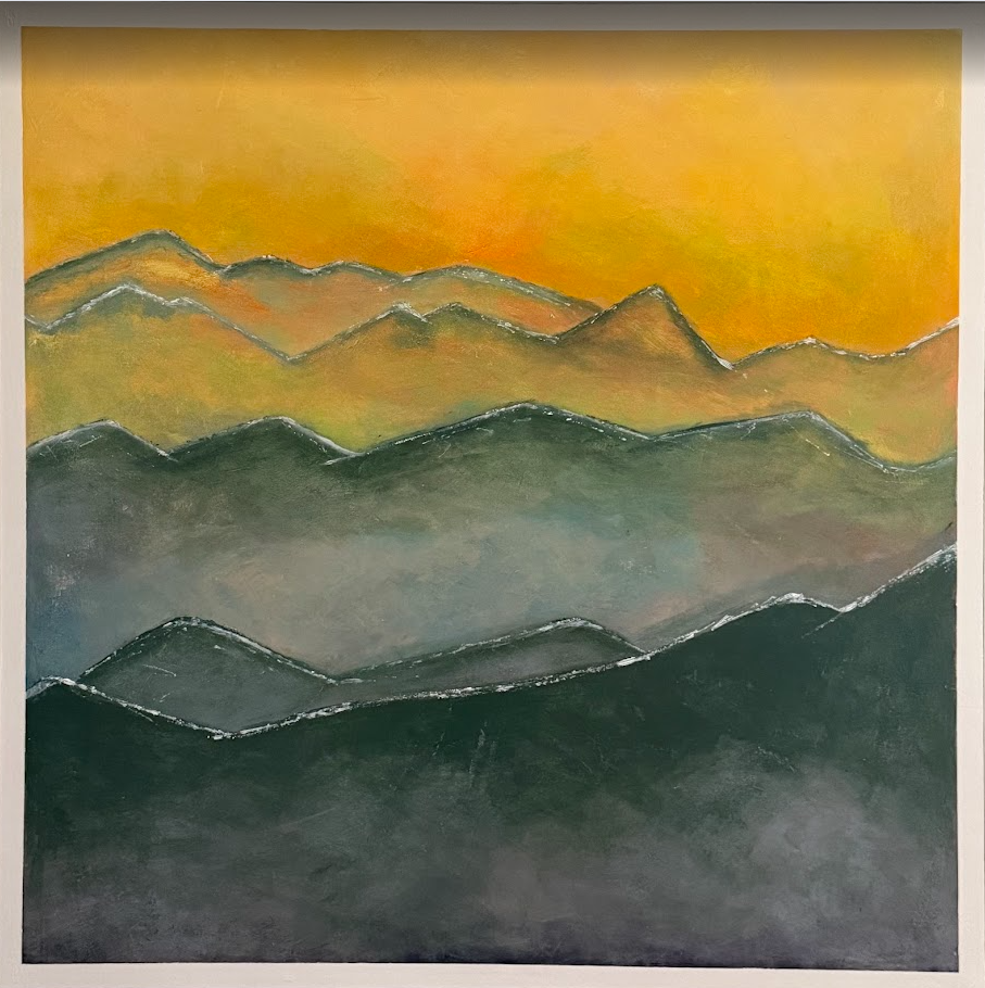 Inspired by a ski trip with my family. At the top of the mountain you can see for miles and miles all the peaks of the mountain range. It was breathtaking. Adding in the golden glow of yellows gives a nod to sunsets.